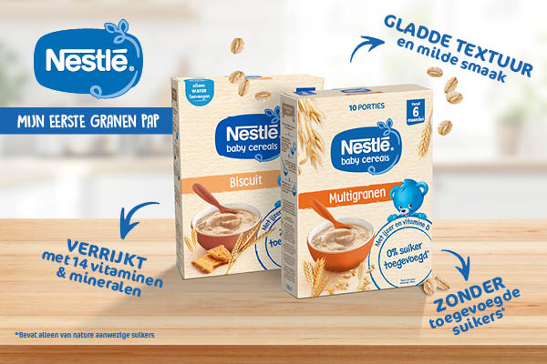 Ontdek nieuwe smaken en structuren met een voedzame papfles. Neem bijvoorbeeld de NESTLÉ baby cereals Multigranen, boordevol granen en verrijkt met ijzer en vitamine D en zonder toegevoegde suikers*. Perfect voor kleine buikjes vanaf 6 maanden.